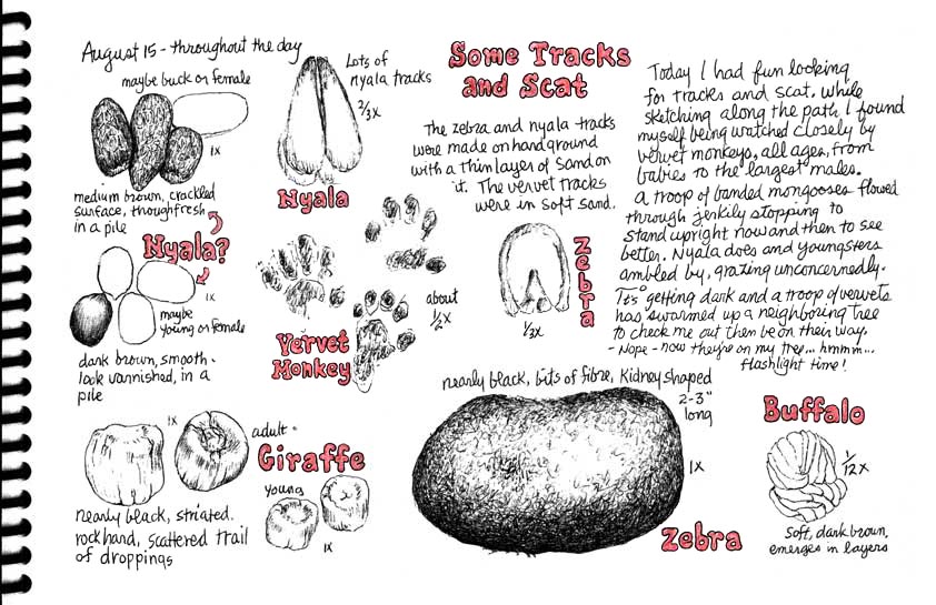 Winter in South Africa is mild and lovely. Every day was a day to sketch, a day to explore and wander about (keeping leopards and rhinos in mind, of course). The first part of Irene's trip was spent in tracking school where she learned to tell one track from another, and she's glad to share her expertise with you on a page or two like the one here.