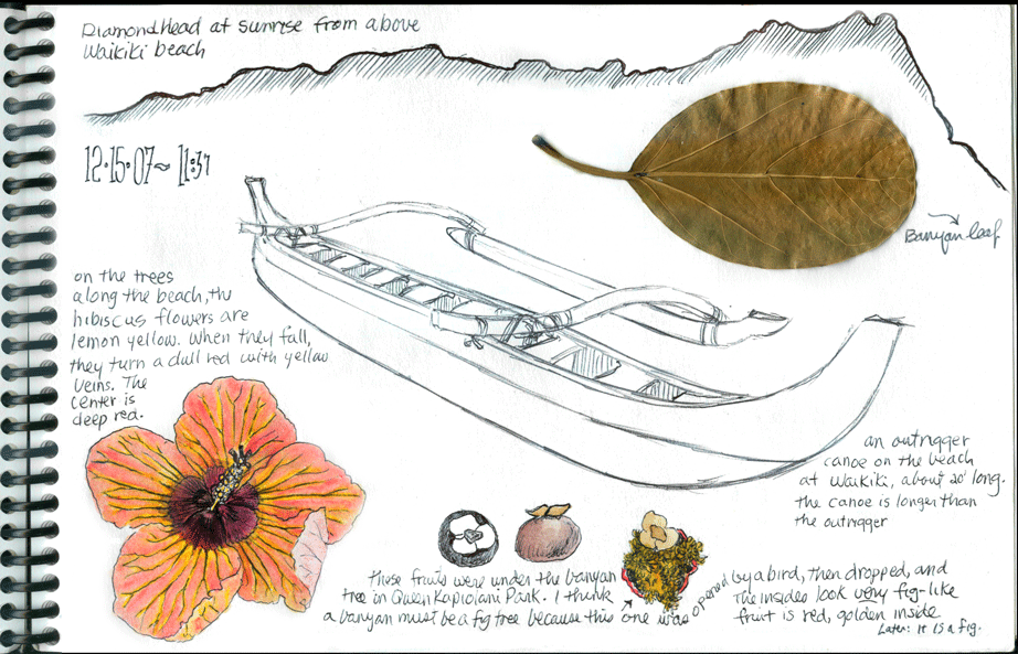 Does your journal suffer from humdrum prose, One of Irene's journal pages... boring notes, and/or dull, lifeless pages? Wouldn't you like your journal to be well-designed and colorful, to dress up your observations with lively sketches and fun mementos ~ and express yourself eloquently with creative writing, poetry and haiku (short, Japanese tone poems)?
