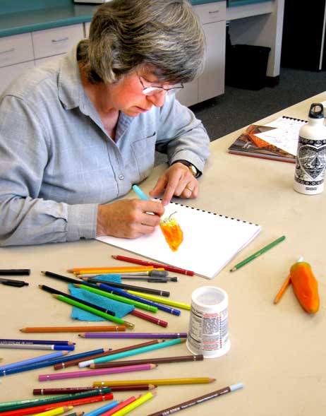 Student tries a pepper portrait... This was Lita's gourd...       Bring only your lunch, a cup for tea or coffee, and an adventuresome attitude. All supplies you'll need for this workshop are provided. We'll use the same tools as in the basic drawing class, plus a micron pen and watercolor pencils. If you want to purchase your own tools for working at home, use the list at the end of the basic drawing class above, then add a micron pen and a basic set of 12 watercolor pencils (available in local art stores). We'll use a wide selection of colors during the class, but the basic twelve will get you started.