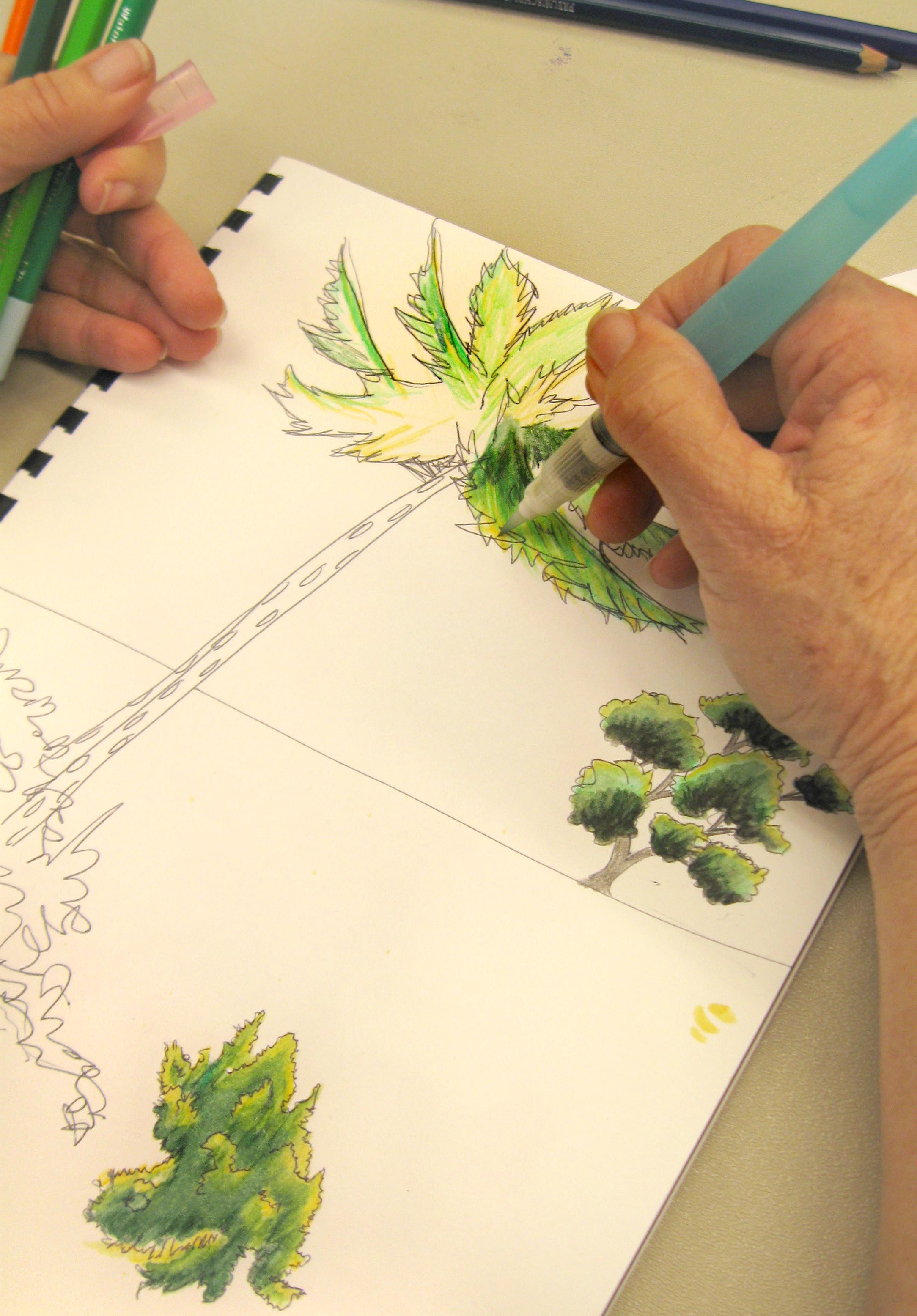 You'll warm up with some right-brain sketching to give you something to color, then we'll break out the watercolor pencils and waterbrushes (paintbrushes with a water supply in the barrel) and start right to work.